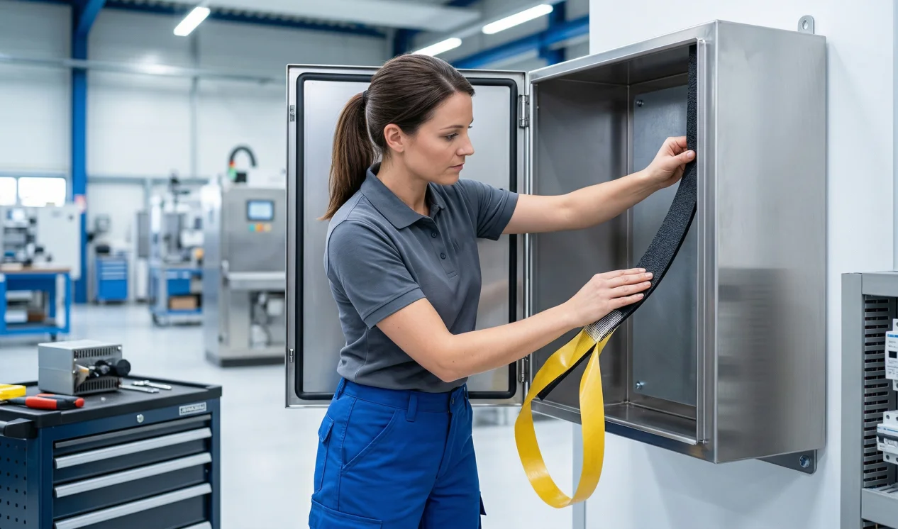 इलेक्ट्रिकल कैबिनेट आ सर्वर रैक कें लेल,क स्व-चिपकने वाला रबर पट्टी धूल आ पानी कें खिलाफ एकटा आईपी-रेटेड(Ingress Protection)सील प्रदान करयत छै.ई एकटा ईएमआई/आरएफआई ढाल गैसकेट कें रूप मे सेहो काज करयत छै जखन प्रवाहकीय कणक सं संसेचित कैल जायत छै,संवेदनशील इलेक्ट्रॉनिक्स कें विद्युत चुम्बकीय हस्तक्षेप सं बचाव करयत छै.